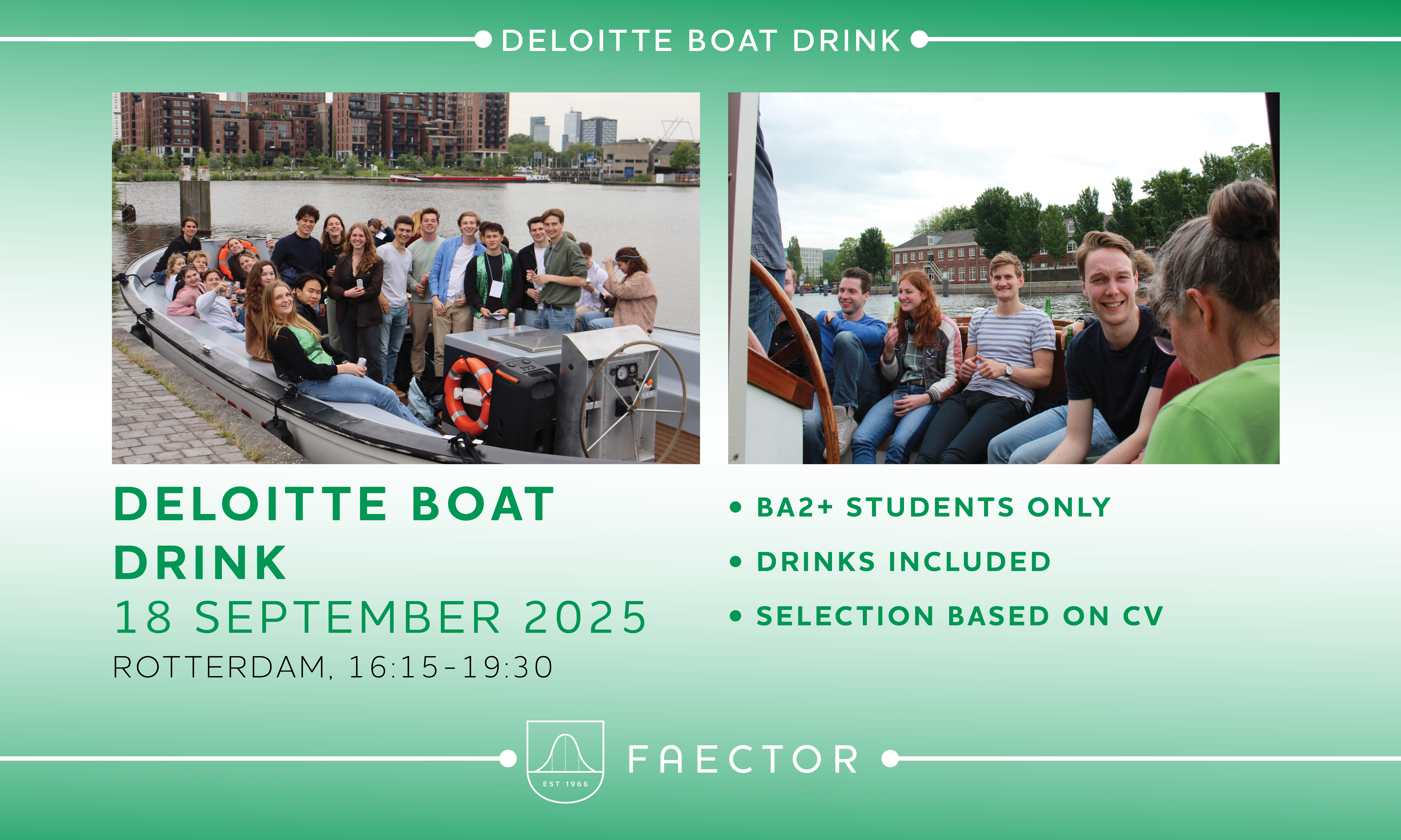 It's almost time for the Deloitte X FAECTOR Boat Drink event in Rotterdam! On September 18, 2025, Deloitte is coming to Rotterdam with a number of employees to meet you.