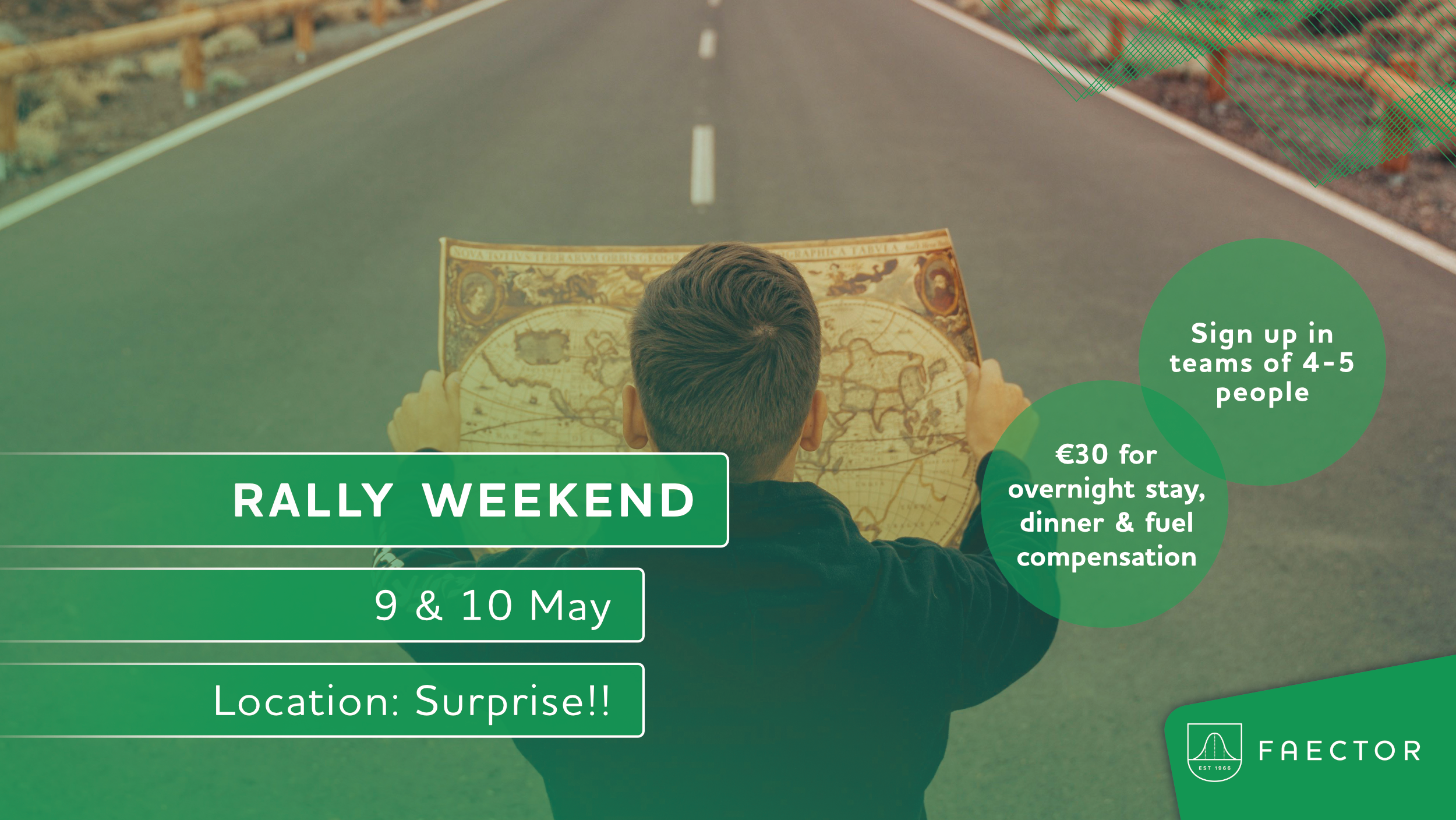 Dear adventure enthousiasts, get ready for this year’s special Lustrum Rally Weekend! We will be venturing to an unknown destination outside of the Netherlands (or maybe not, who knows…). The trip will kick off on the 9th of May and conclude on the 10th.